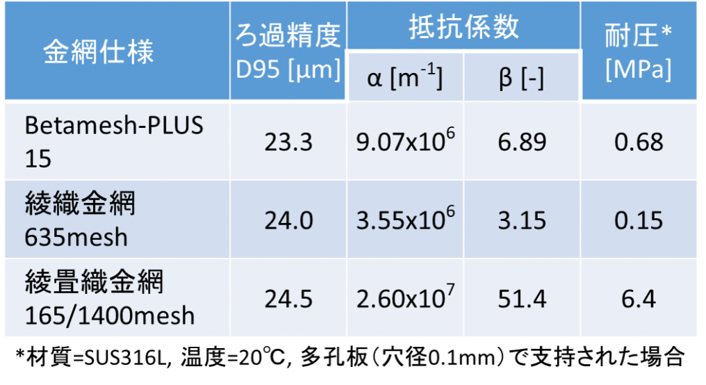 The table shows a comparison of the performance of Betamesh-PLUS, Twilled weave mesh and Twilled dutch weave mesh with similar filtration accuracy.
