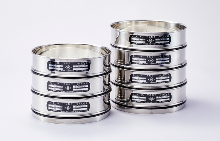 主に粒子径分布測定に用いられる枠付き金網として試験用ふるいがあります。試験用ふるいには非常に高い目開き精度が要求され(JIS Z 8801-1)、厳選した金網を使用しています。他にも様々なふるい機やふるい分けスクリーンがあります。例えば、上記スクリーン紹介では振動により粉体を流動化させるふるい分け装置を例に挙げていましたが、気流によって流動化させる風力ふるい機もあり、円形のスクリーンなどが使用されます。トロンメルと呼ばれる回転式選別機には、大きな円筒や六角形状のスクリーンが使用されます。モーゲンセンサイザーは、複数段の角形のスクリーンを下にいくほど急勾配で傾斜させたふるい機で、実際の網目の大きさだけでなく、粉体が網目に入る角度によってもふるい分けの分離点を制御しています。